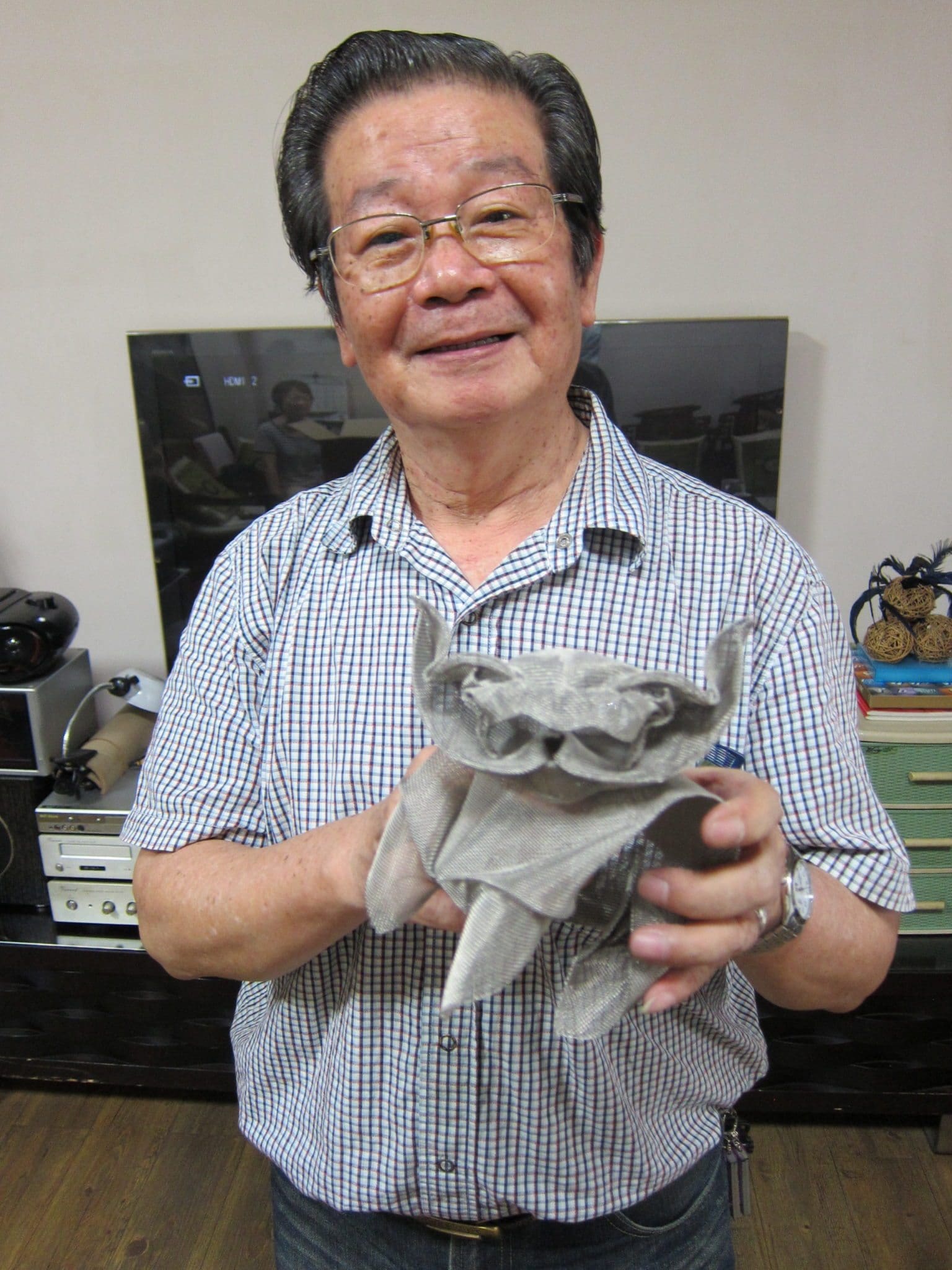 We got on a local train at the main station in Taichung, and then took a taxi to the Ching Kuang Paint Shop, a business Master Lai took over from his father. He ushered us in to a dimly lit room with a couch on one end facing a large flat-screen television.  Mrs. Lai brought in fruit and tea while Chen-Hsiang flicked through as many as 500 photos of his art.  There was art of every genre; paintings; sculpture in wood, cardboard, and wire; cut-out paper designs, and of course, origami.