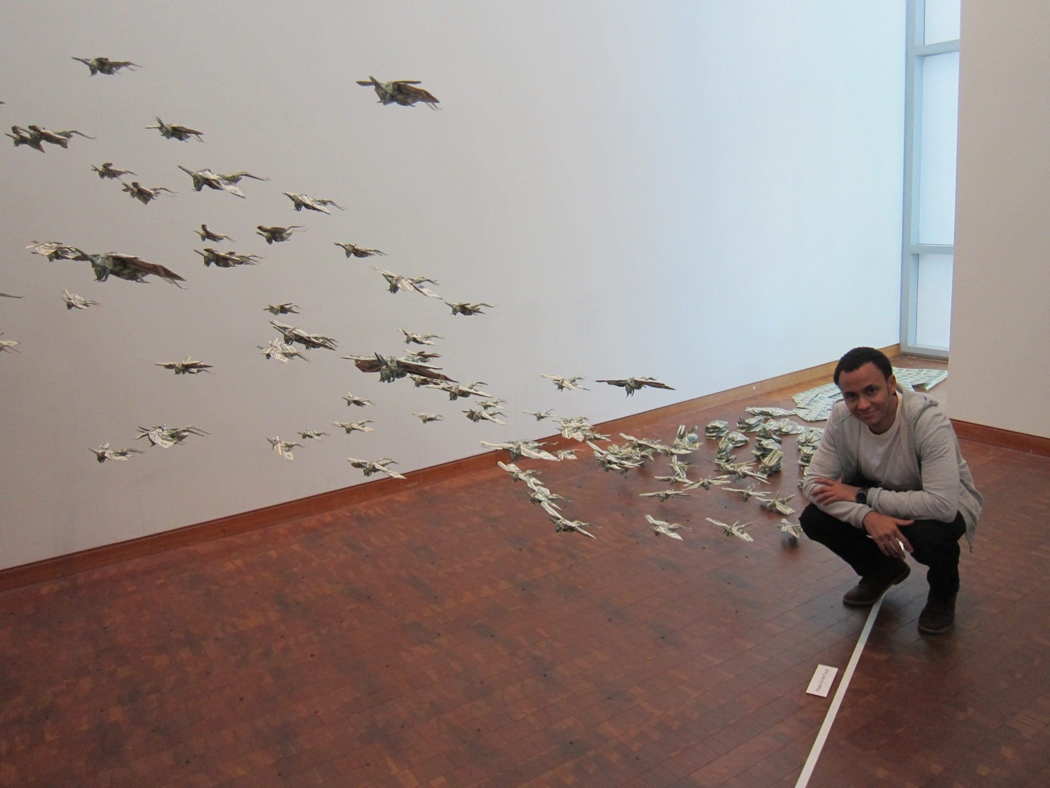 Present for the opening were several of the more than 40 artists who contributed their work, all of them known colleagues and friends to me. These were Vanessa Gould, Martin Demaine, and Jeannine Moseley who arrived from eastern USA; Krystyna and Wojtek Burczyk from Poland; Jared Needle, Linda Tomoko Mihara, and myself from California; and Sipho Mabona from Switzerland. I mention Sipho last because, in my view, his contribution was conceptually more modern than most of the other artists, and thus stands out for special mention. Sipho’s work was an installation of stacks of dollar bill sheets (the kind that are printed at the federal mint before being cut into individual bills) that were transformed into partially folded insects, and finally to a swarm of locusts that rose from the floor. His origami was about making a statement about our consumer economy. I have seen hundreds of beautifully folded insects at conventions that yell “look at how complex this is”. It was a relief to see a masterful complex insect saying something more.  Sipho had spent  months folding hundreds of these insects, just for this one exhibit. I watched a group of children point in all directions as they admired his work. Clearly it was working on many levels for all age groups. This is one of the great advantages of having an origami exhibit. All ages and cultures can experience and share origami. This was best displayed by the contribution of Miri Golan whose figures that emerged from two books, the Torah, and the Koran, mingled together in harmony. You can see another blog about Sipho’s contribution to the exhibit at: http://www.mymodernmet.com/profiles/blogs/sipho-mabona-locusts-origami