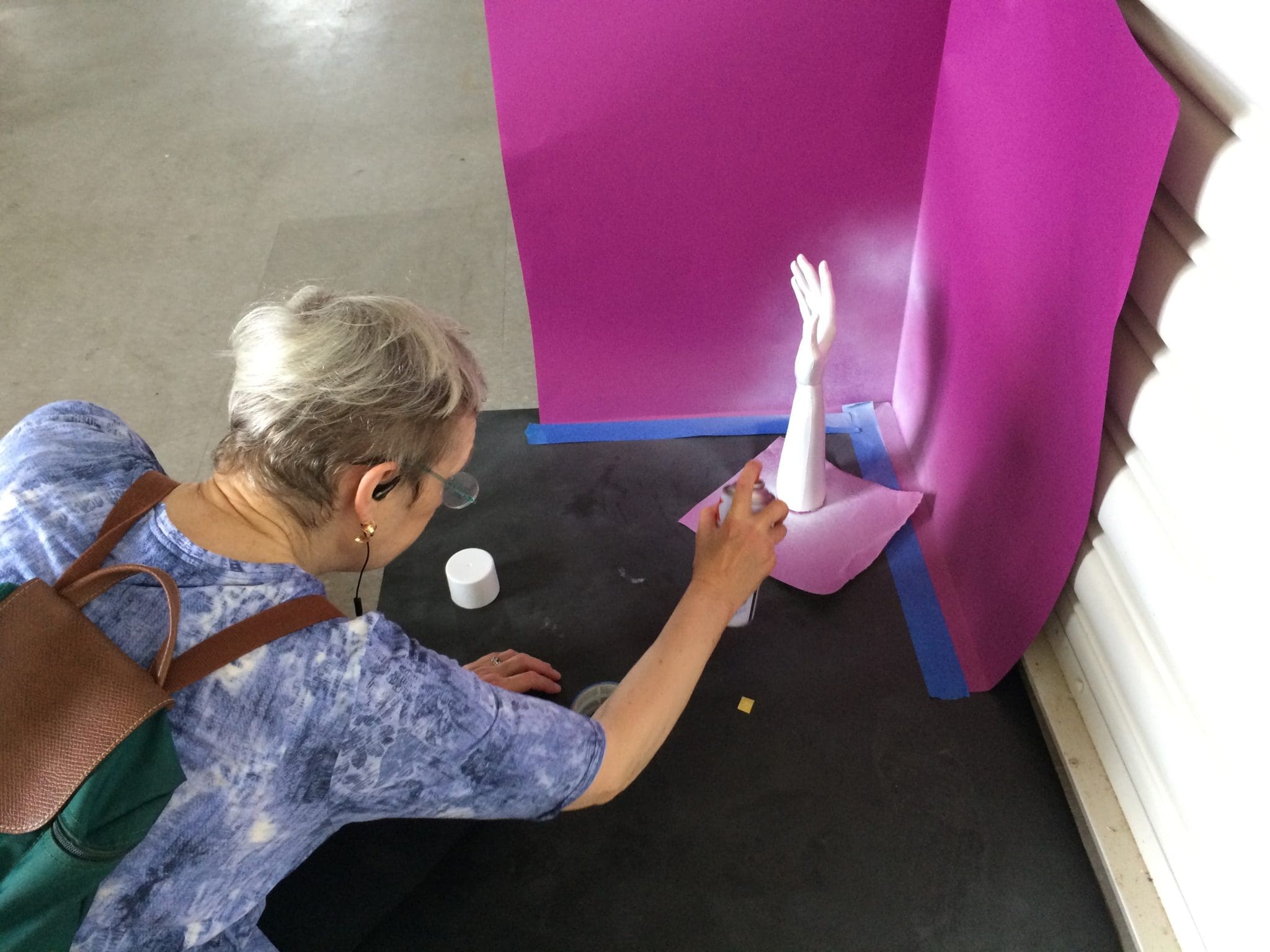 Charles Tsai waits for the exhibit to open by the official entrance under a folded tunnel while Hoang Tien Quyet teaches participants how to fold his cat hat behind Charles.