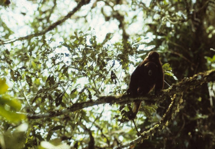 We failed to find the elusive tupa during several more field trips. I was at the point of giving up hope of seeing a spectacled bear as well, although the scars of their claws on trunks were everywhere. On the 28th day in this forest we saw a rare sight. The rain stopped. Blue sky filled the gaps in the leaves, and water drops glistened. Then we heard barking and a crash off our trail. We followed Daniel as he dashed through underbrush. When we caught up with him, a male yellow-tail had descended to within 20 feet of us overhead. He was shaking branches and displaying blue testicles surrounded by yellow hair. Here was something lost to science, but very much in the conscience of Daniel. “Tupas”, he said matter -of-factly. I barely had time to assemble my camera and squeeze off a shot at a mother with child on her back, before they disappeared in tree tops.