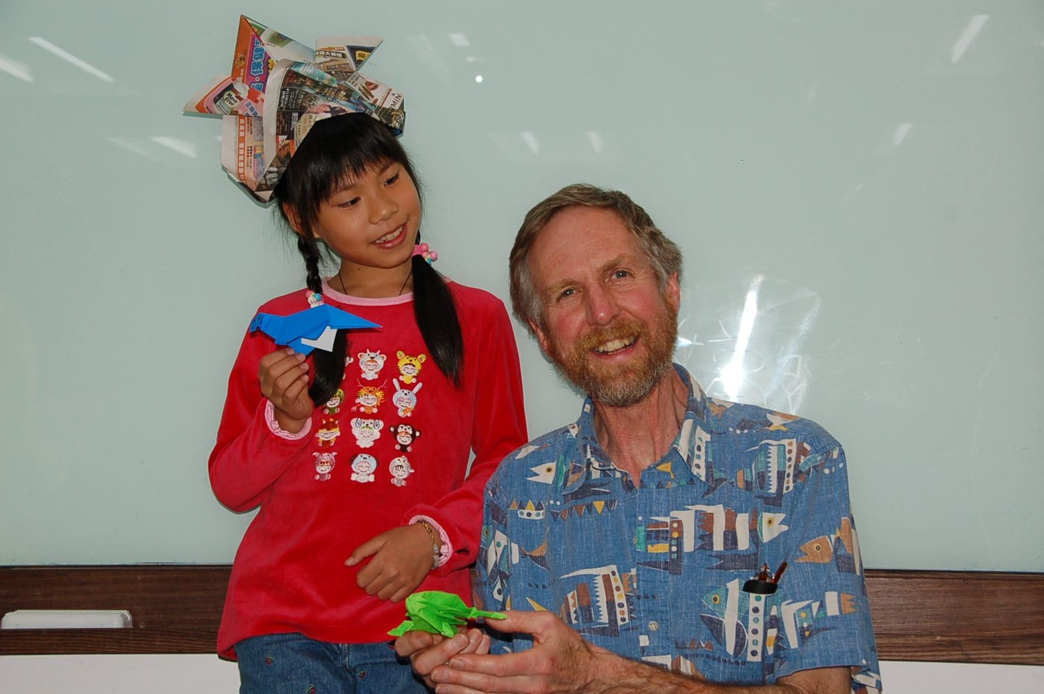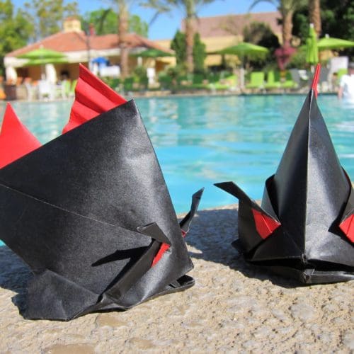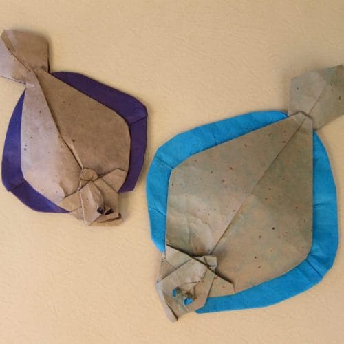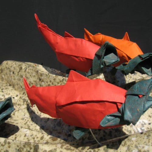 Since 2008 I have taught origami almost every Thursday of the school year to patients and their families at the UCSF Benioff Children’s Hospital in Oakland, California. Several instances stand out among the many thousands of children who have experienced the therapeutic value of doing origami. A few years back I encountered a nine year-old boy crying in his hospital room after learning the bad results of a recent blood test for his cancer. His mother was doing her best to preserve her own composure and console him. I peeked in the room and saw a cartoon carp on his laptop. It took me 5-10 minutes to design a similar looking hat to cover his bald head, which he folded himself. He and his mother paraded his achievement around the entire floor of the hospital. Smiles took the place of tears, including the nursing staff. I have seen pain and vomiting stop in patients as they fold. Patients with severe motor issues learn they can make origami creations they are proud of. Patients and their families take a vacation from stress as they experience the fun of folding. An older patient, who was depressed to the point of being uncommunicative after being shot in the head, opened up when he learned he could fold a flapping bird [blog here]. Origami process is a metaphor for getting healthy, one step at a time.